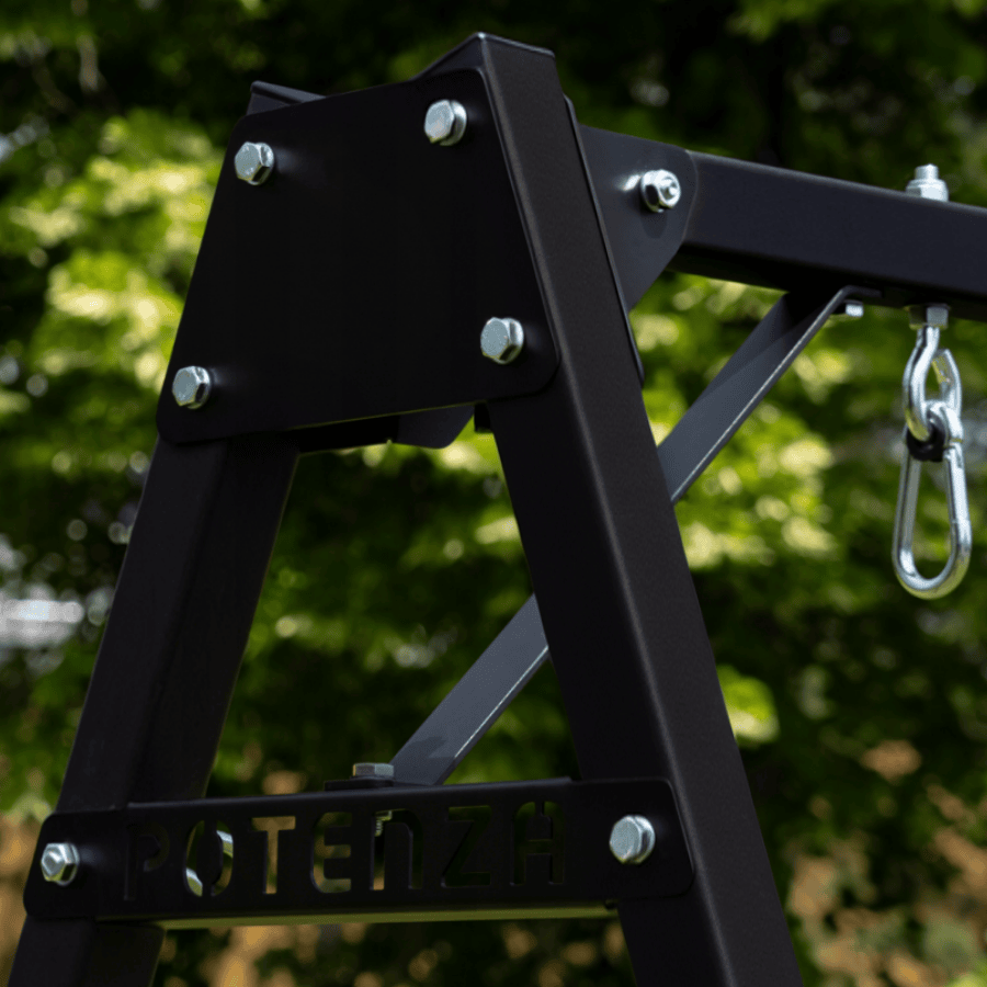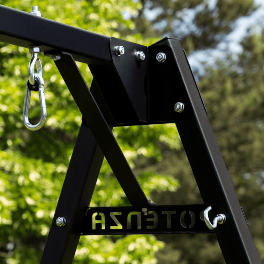 Nohy mají otvory, které umožňují připevnění rámu k zemi, což umožňuje bezpečné používání houpačky.