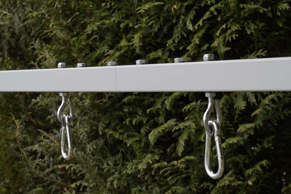 Rám je navíc vybaven dvěma háky, které umožňují zavěšení houpací sítě. Houpačka se tak může stát dětským hřištěm i místem pro odpočinek dospělých. Bezpečnost při hře i relaxaci jest prioritou, proto byla konstrukce vyztužena přidáním vzpěr a podpěr horního nosníku.