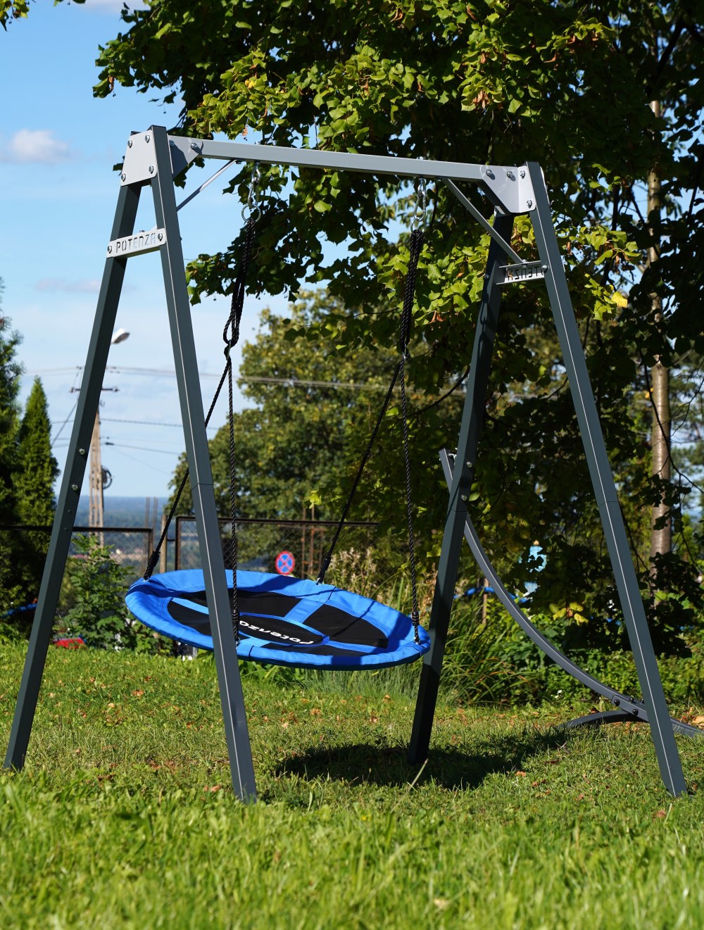 Jednoduchá zahradní houpačka grafitově šedé + čápí hnízdo modré